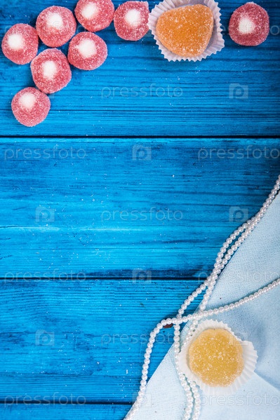Мармелад и бусы на синем деревянном фоне