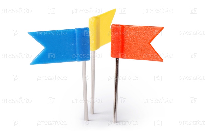 Три канцелярские кнопки в виде флажков разных цветов на белом фоне