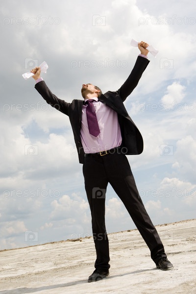 Фото плачущего бизнесмена, стоящего и поднимающего руки с документами на улице