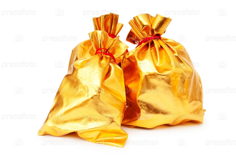 Мешки из золотистой ткани на белом фоне