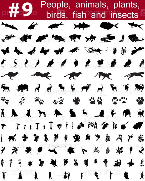 Большая коллекция силуэтов людей, животных, птиц и рыб