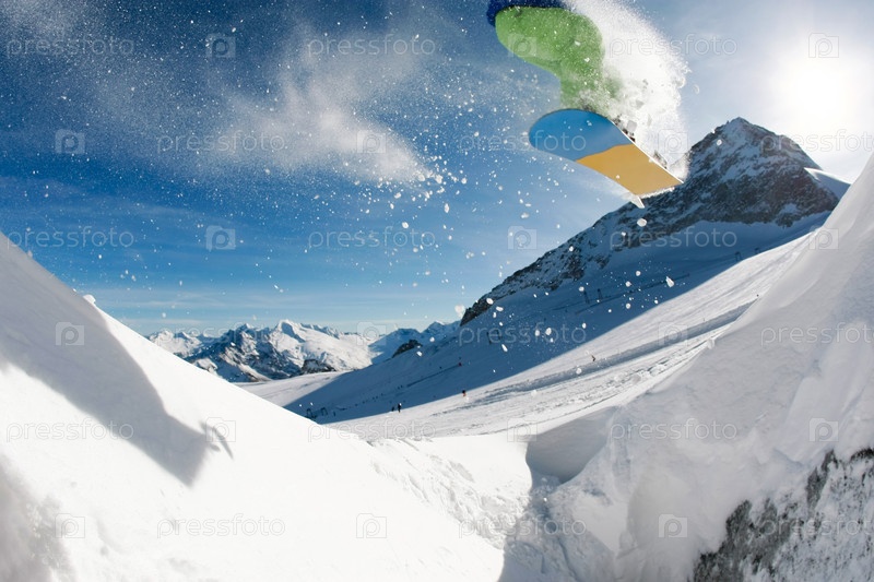 Фото с прыжками сноубордера над склоном горы на зимнем курорте