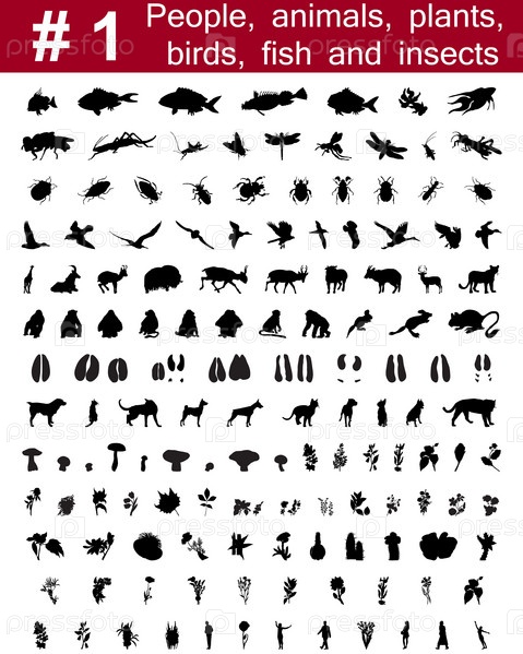 Большая коллекция силуэтов людей, животных, птиц и рыб