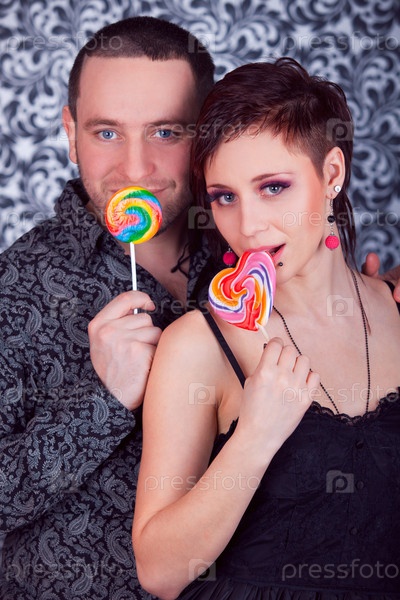 Мужчина и женщина с леденцами на палочке в руках