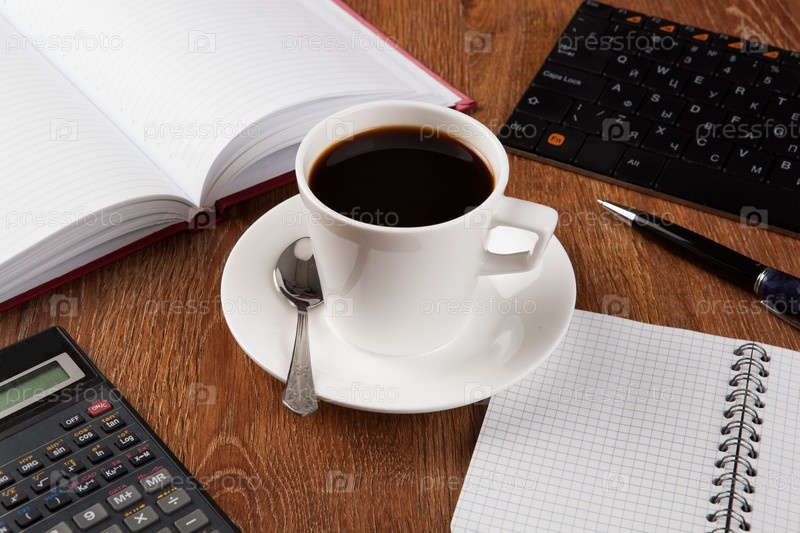 Канцелярские принадлежности с чашкой черного кофе на столе