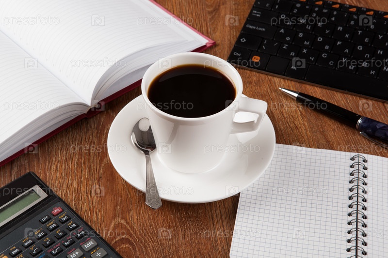 Канцелярские принадлежности с чашкой черного кофе на столе
