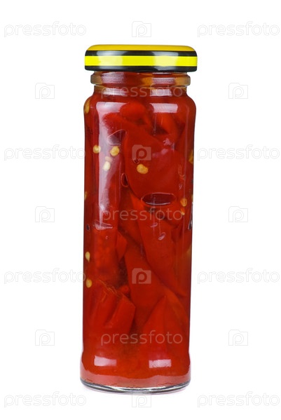 Стеклянная банка с маринованными красными перцами чили на белом фоне