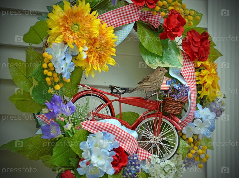 Воробей сидит в венке на двери