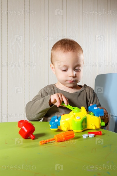 Маленький мальчик ремонтирует игрушечную машинку