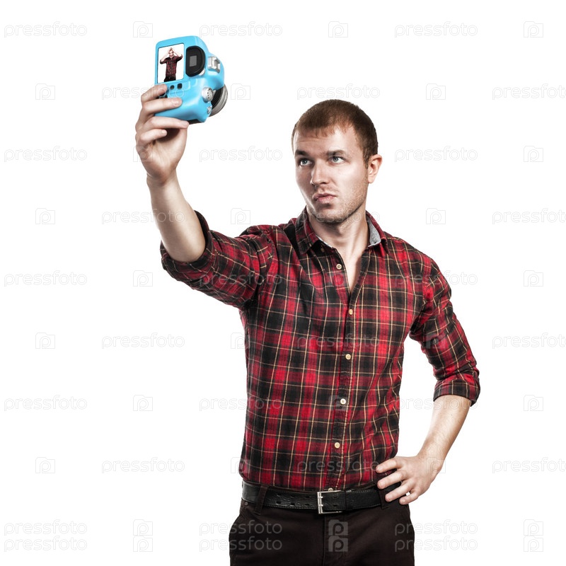 Мужчина с фотоаппаратом, изолированный на белом фоне