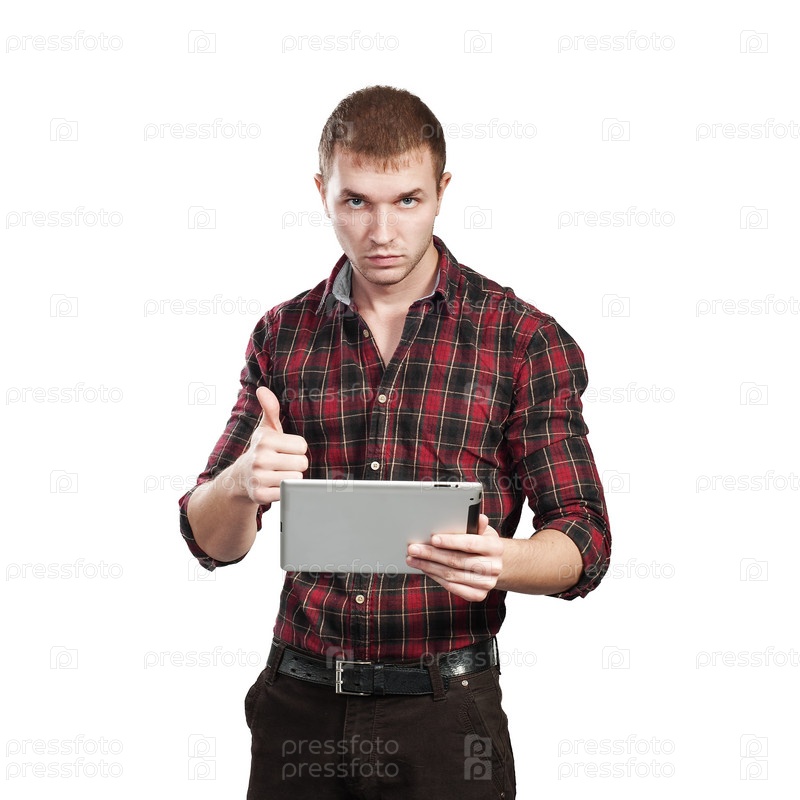 Мужчина с планшетом в руках. Изоляция на белом фоне