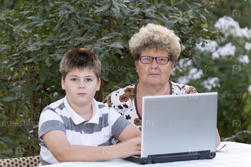 Пожилая женщина с внуком работает на компьютере в саду