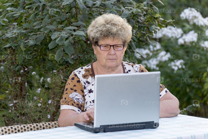 Пожилая женщина работает на компьютере в саду