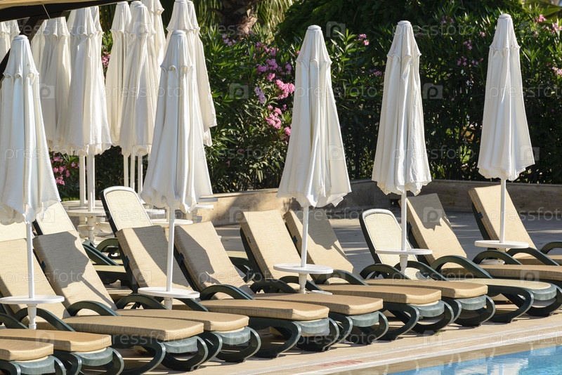 Шезлонги и зонтики у бассейна