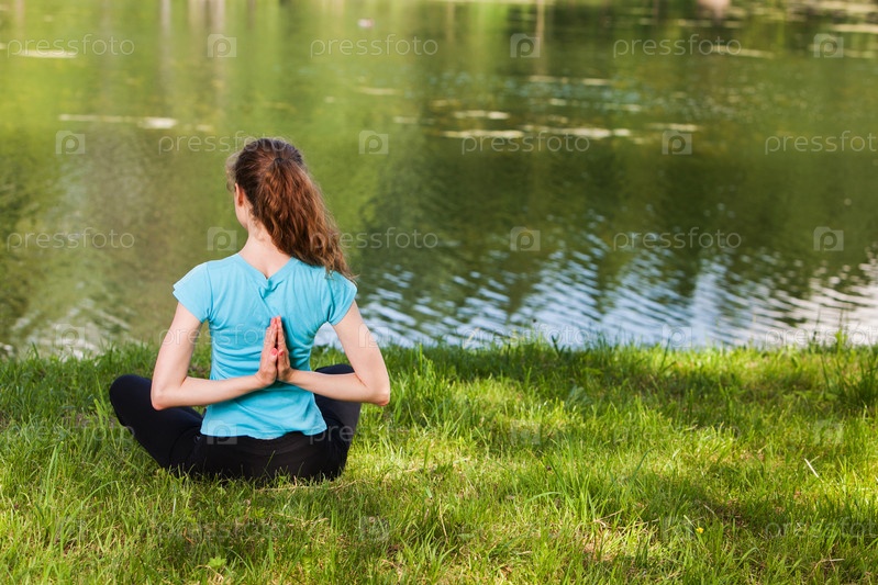 Женщина медитирует на берегу