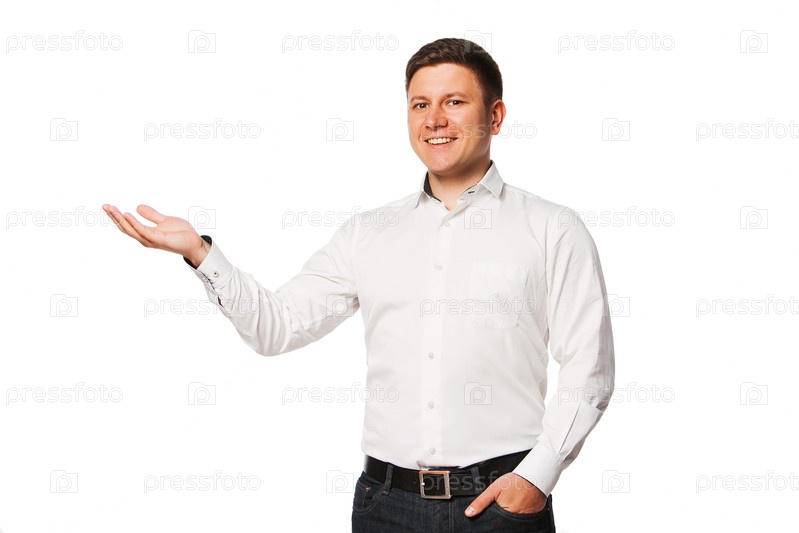Улыбающийся мужчина показывает что-то на ладони
