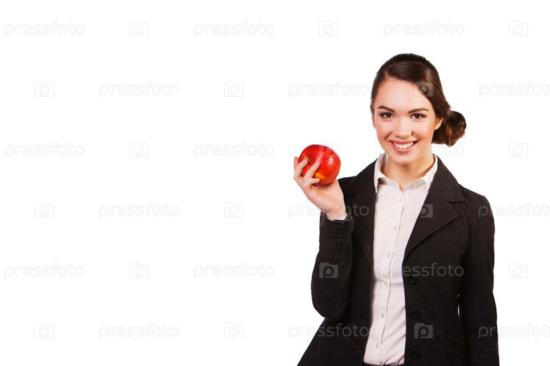 Женщина с красным яблоком в руке на белом фоне