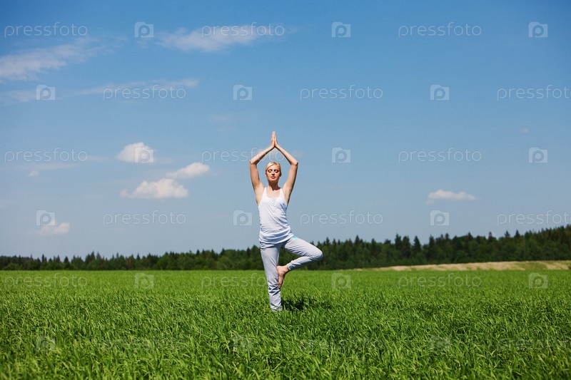 Красивая молодая блондинка занимается йогой на поляне