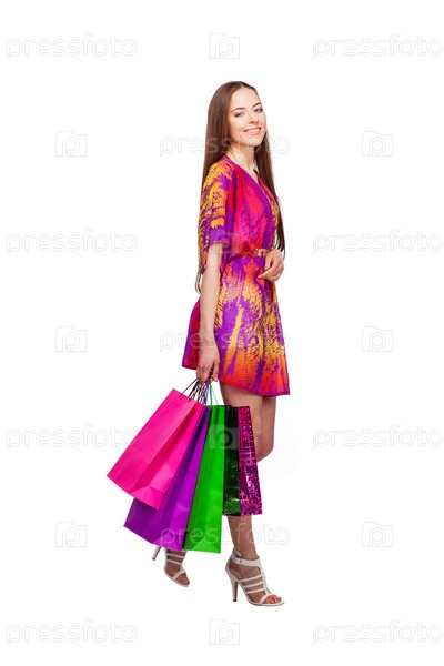 Портрет молодой женщины с покупками на белом фоне