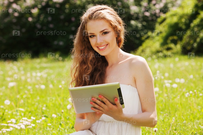 Молодая женщина с планшетом на траве