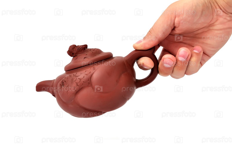 Коричневый керамический чайник в руке на белом фоне