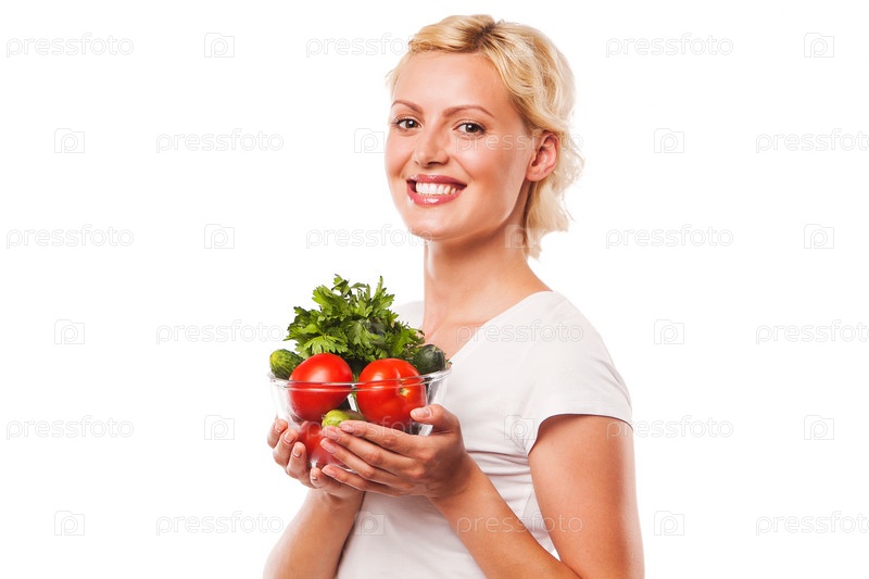Красивая женщина с тарелкой овощей на белом фоне