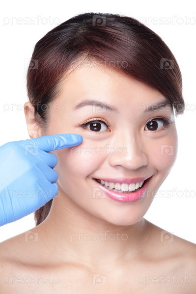 Женское лицо и руки в хирургических перчатках