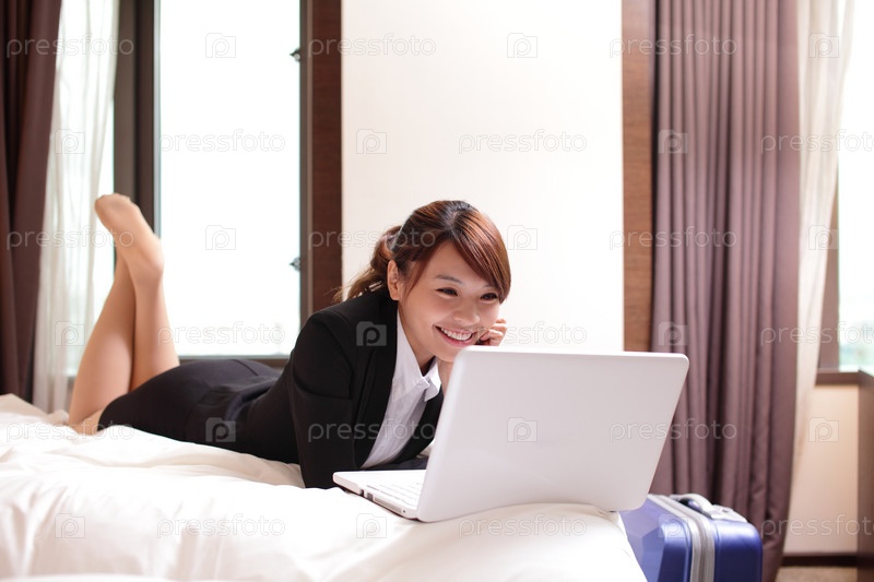 Деловая женщина с ноутбуком в отеле