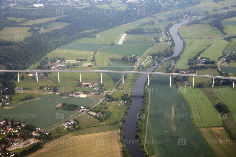 Вид с высоты птичьего полета на мост через реку в пригороде Дюссельдорфа, Германия