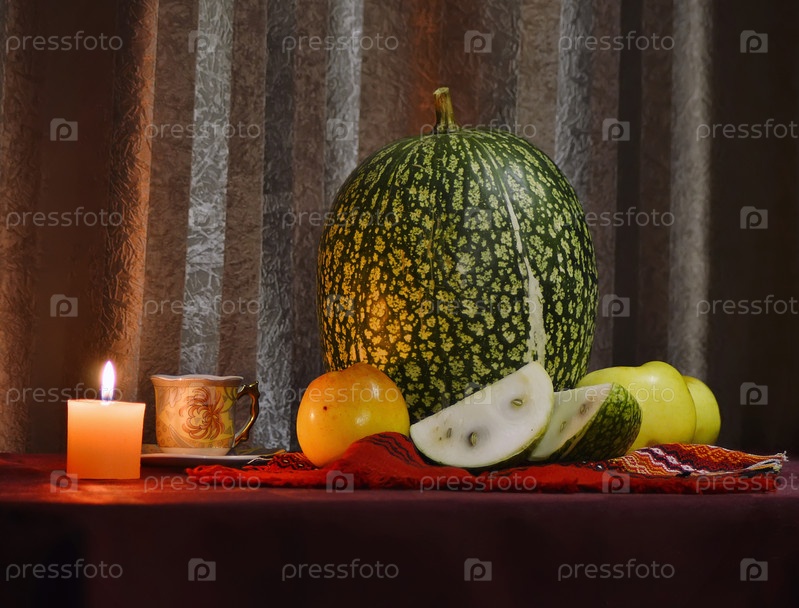 Осенний натюрморт с тыквой,яблоками и свечой