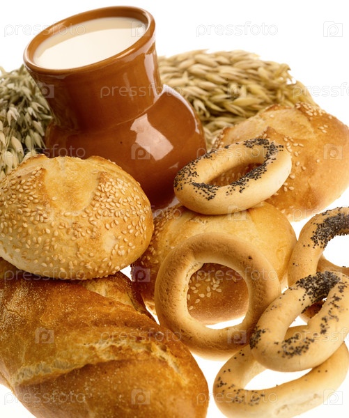 Хлебобулочные изделия и кувшин молока на белом фоне