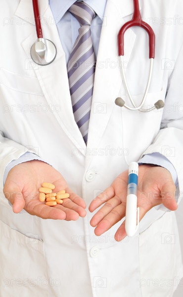 Врач держит инжектор для овуляции и таблетки