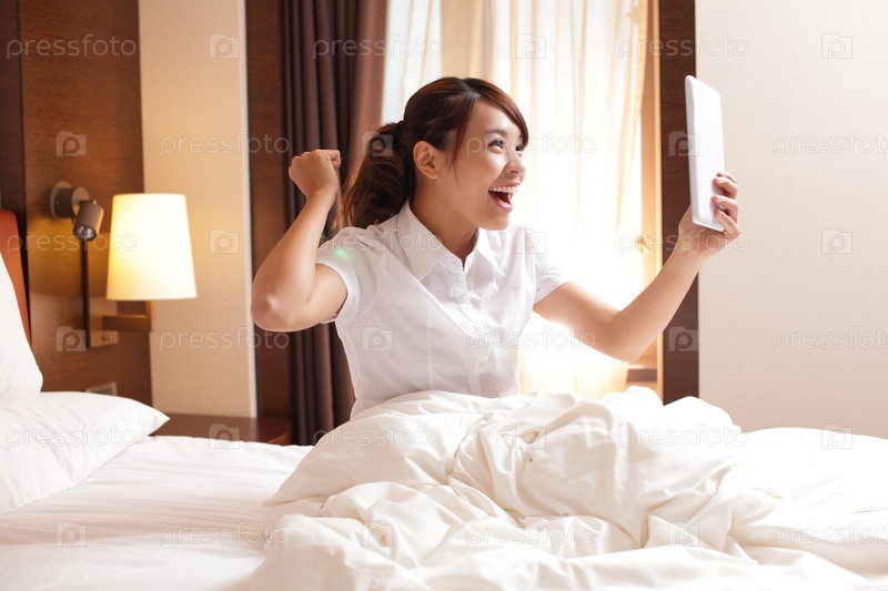 Бизнес-леди с цифровым планшетом в кровати