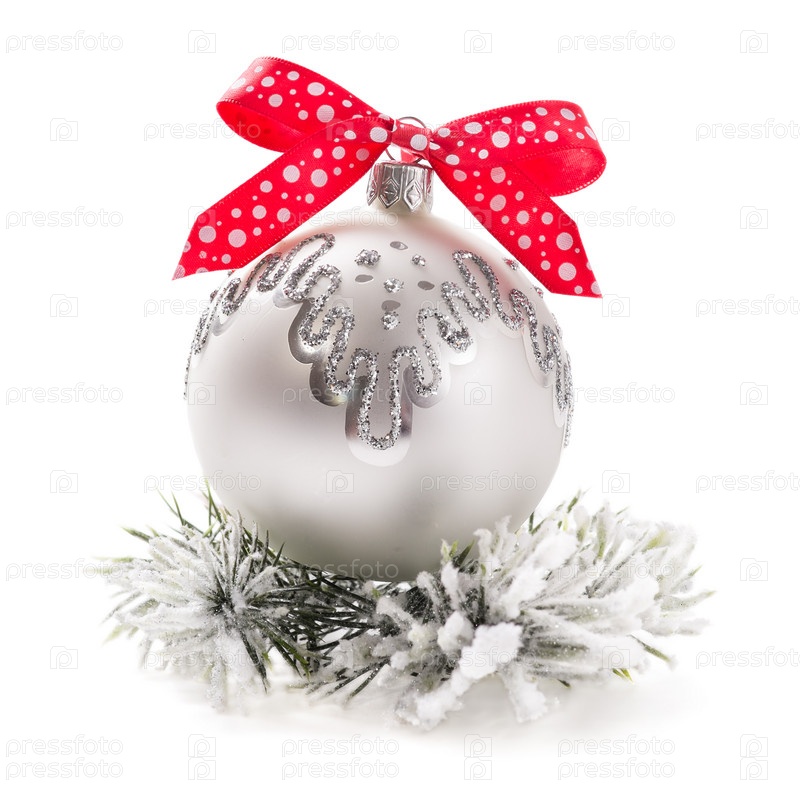 Рождественская игрушка с красной лентой на белом фоне