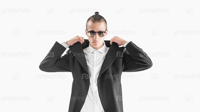 Молодой мужчина в костюме позирует на светлом фоне