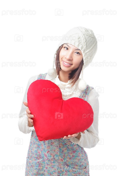 Девушка держит подушку в форме сердца