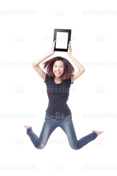 Девушка прыгает с планшетом