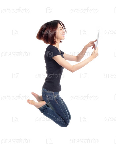 Девушка прыгает с планшетом
