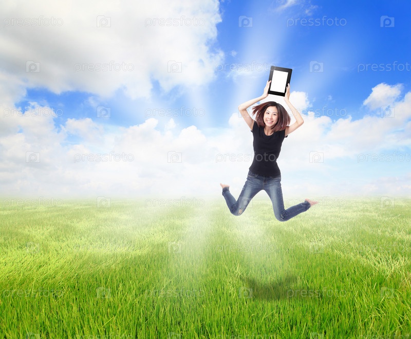Счастливая девочка с планшетом прыгает на поляне