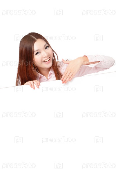 Женщина показывает на баннер