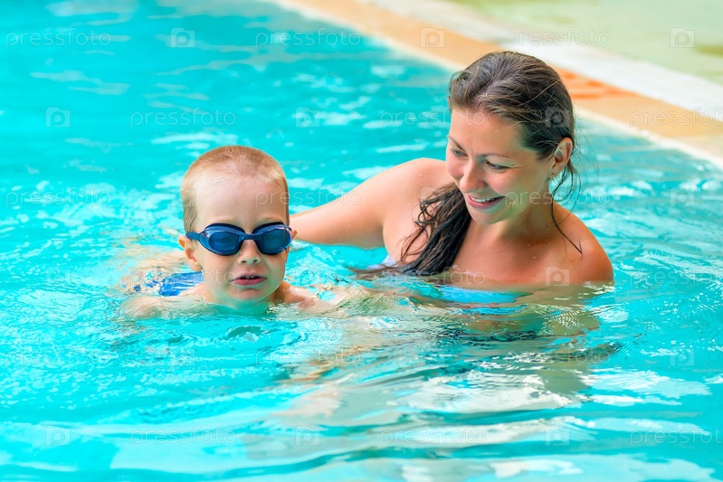 Мать учит сына плавать