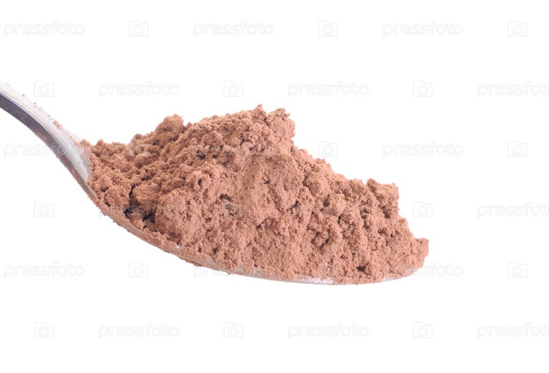 Какао-порошок в ложке на белом фоне