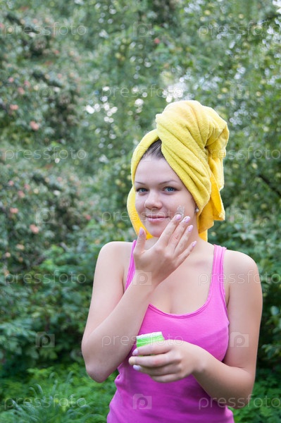 Женщина с полотенцем на волосах держит крем для лица