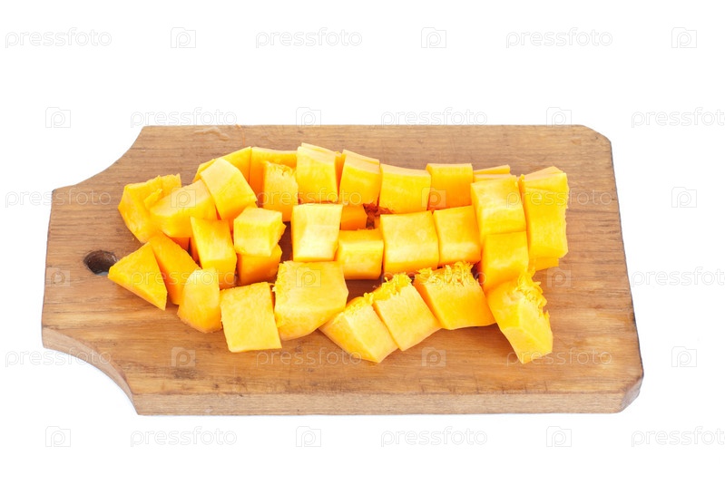 Ломтики тыквы на разделочной доске на белом фоне