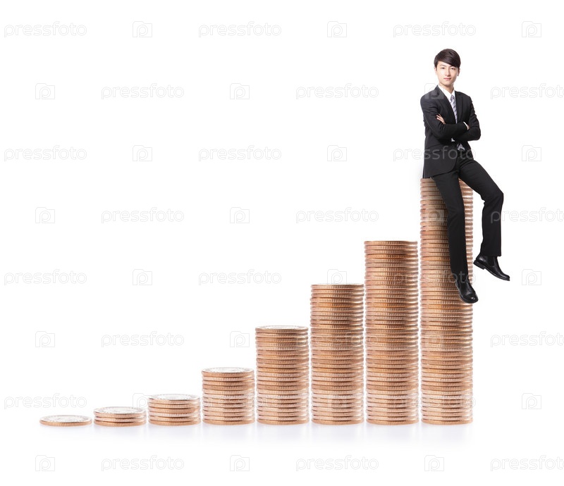 Успешный деловой мужчина на стопке денег