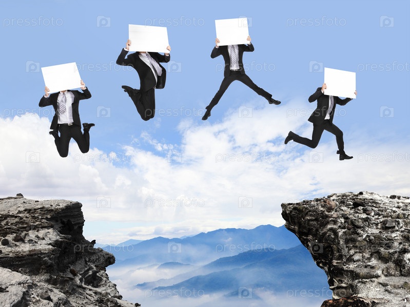 Деловой человек прыгает с билбордом в руках