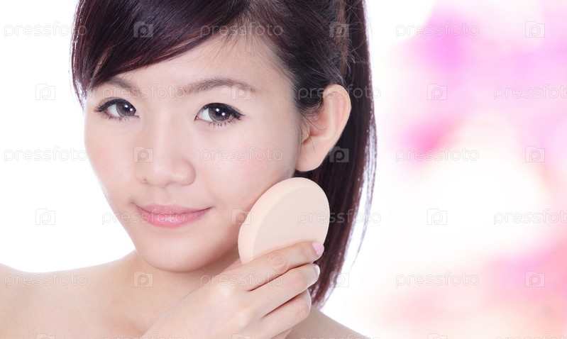 Женщина наносит тональный крем