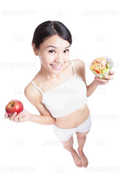 Женщина с салатом и яблоком