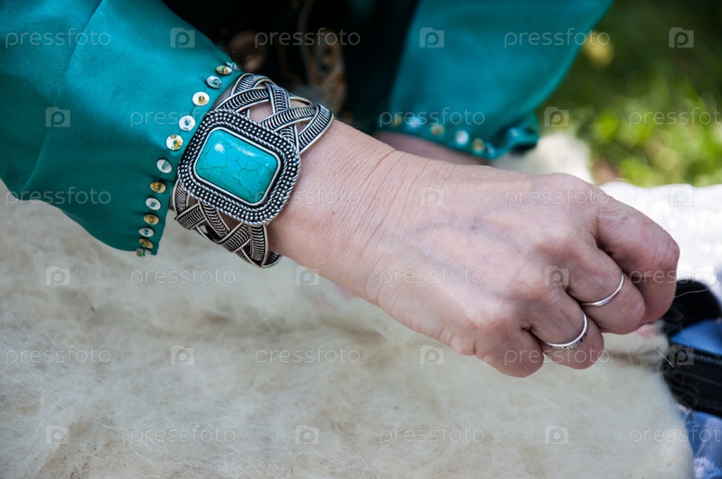 Руки мусульманской женщины обрабатывают шерсть