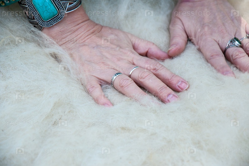 Руки мусульманской женщины обрабатывают шерсть